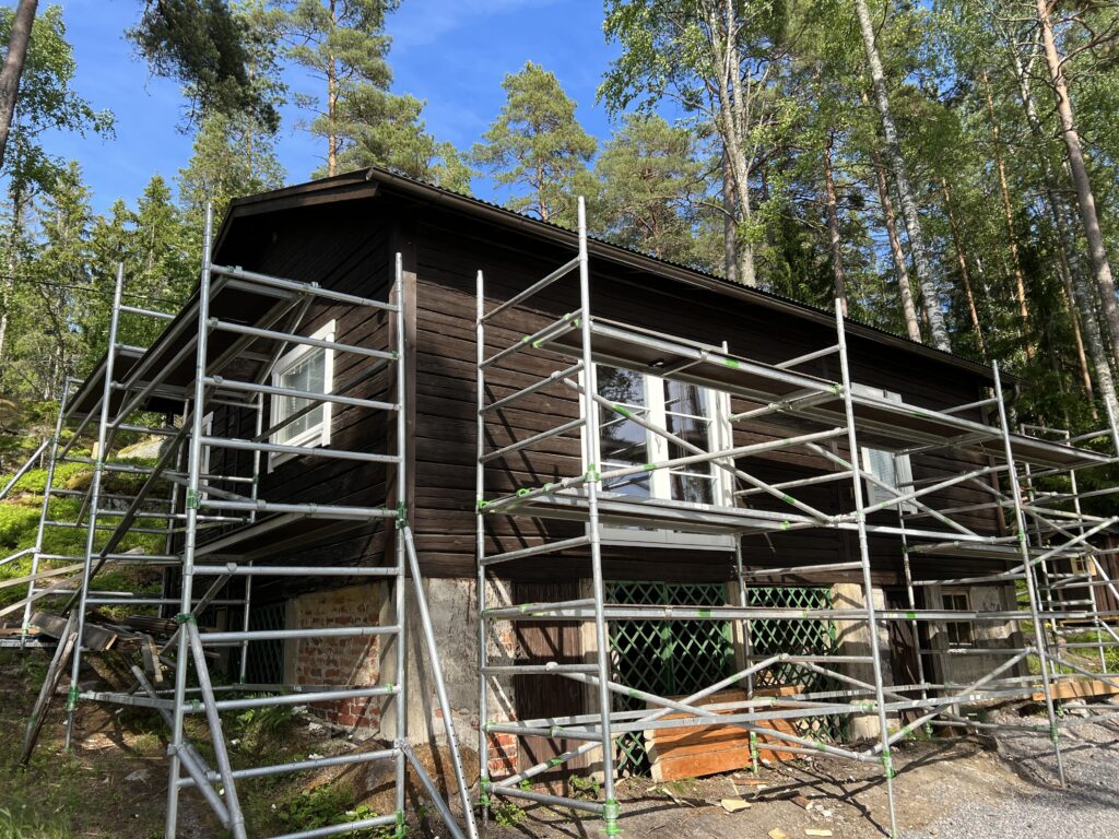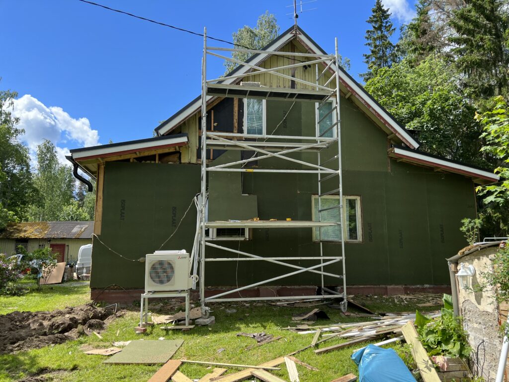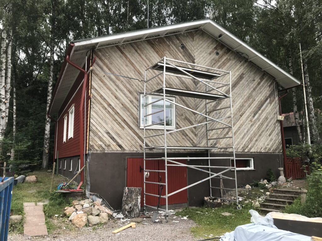 Kuten kunnon julkisivuremontissa kuuluukin, puretaan lähes poikkeuksetta nykyinen julkisivumateriaali runkorakenteeseen asti, oli se sitten vinolautarunko, hirsi tai pystyrunko, jotta voidaan olla varmoja rakenteiden oikeanlaisesta toimivuudesta.