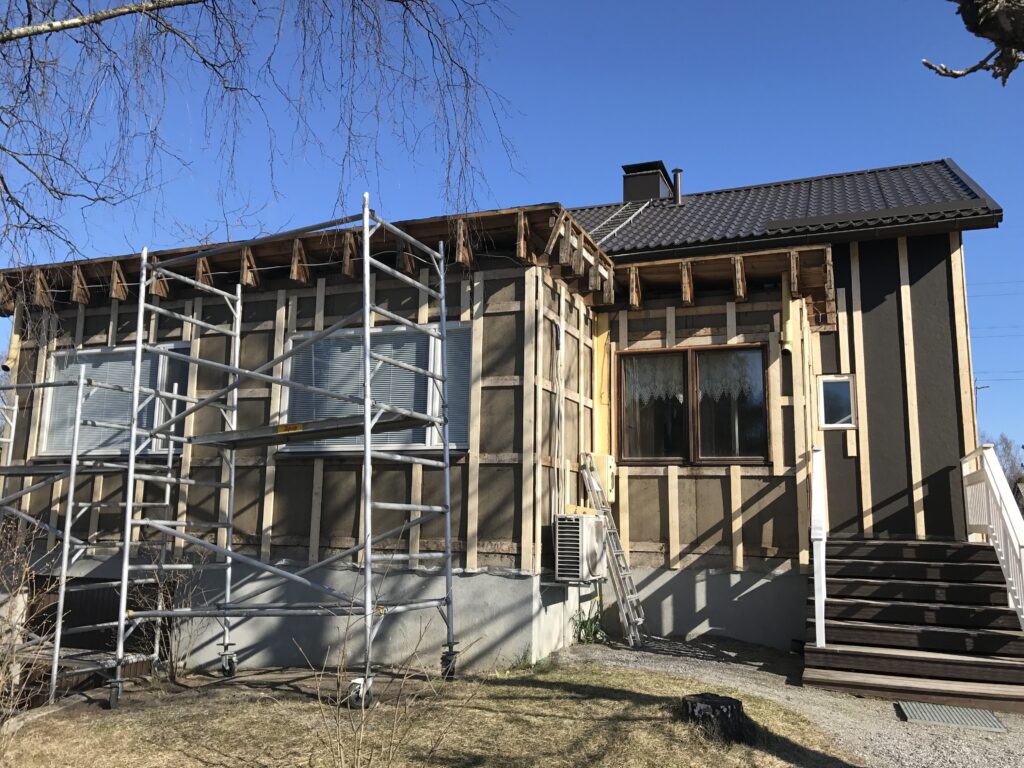 Vanhan julkisivumateriaalin purkamisen jälkeen asennetaan joko tuulensuojaksi 13mm hengittävä tuulensuojalevy, tai hieman lisä-eristystä antava 25mm versio. Lisäksi on myös vaihto-ehtona toteuttaa ns ”lämpöverhous” jolloin tehdään lisä-eristys koolauksella sekä ekovillalla toteutettuna.