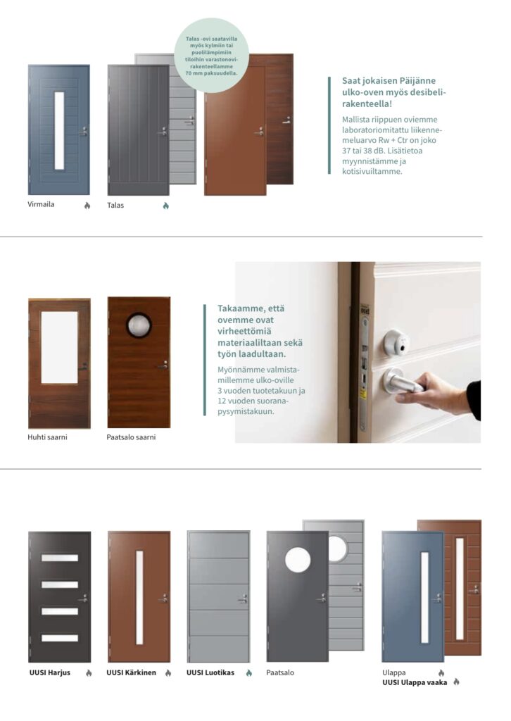 Päijänne-ovia valmistetaan 25 vuoden ulko-ovi- ja 60 vuoden puunjalostuskokemuksella, joten heillä on tieto ja taito valmistaa tuotteet kestämään maamme ankaria sääolosuhteita; torjumaan pakkasta, sietämään kosteutta, suodattamaan ääniä ja kestämään tarvittaessa tulipaloakin.