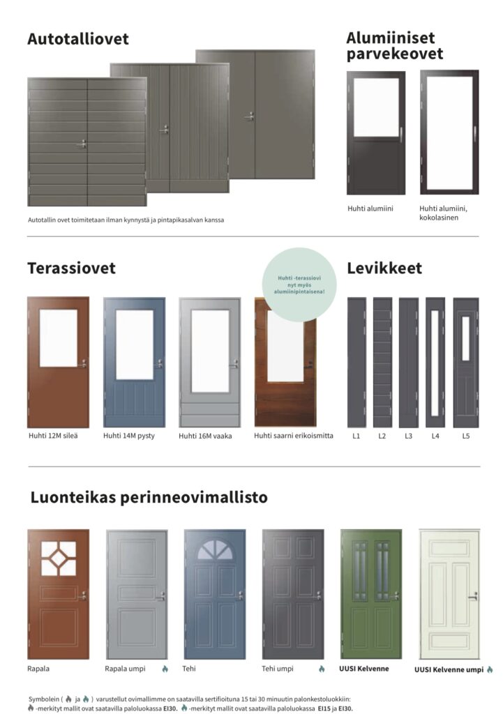 Olemme mielellämme kumppanisi ulko-oviprojektissasi, oli sinulla sitten uudisrakennus, remontointikohde, taikka vapaa-ajan asunto. Valikoimistamme löydät kauniit lämpörakenteiset vakiomallimme levikkein, sekä sivu- ja yläikkunoin. Valmistamme ovia myös asiakkaiden omien suunnitelmien ja arkkitehtikuvien mukaan. Niin uniikkikappaleet kuin mallistotuotteemmekin valmistetaan aina tilauksesta, joten räätälöinti mieltymyksiesi mukaan on mahdollista kaikissa tapauksissa. Siltä osin kuin asiat eivät ole sinulle tuttuja entuudestaan, kerromme mielellämme lisää ja autamme valinnoissa.