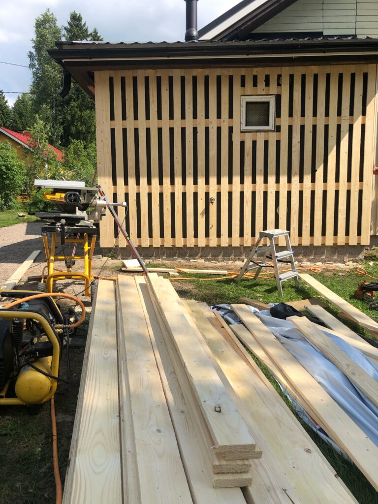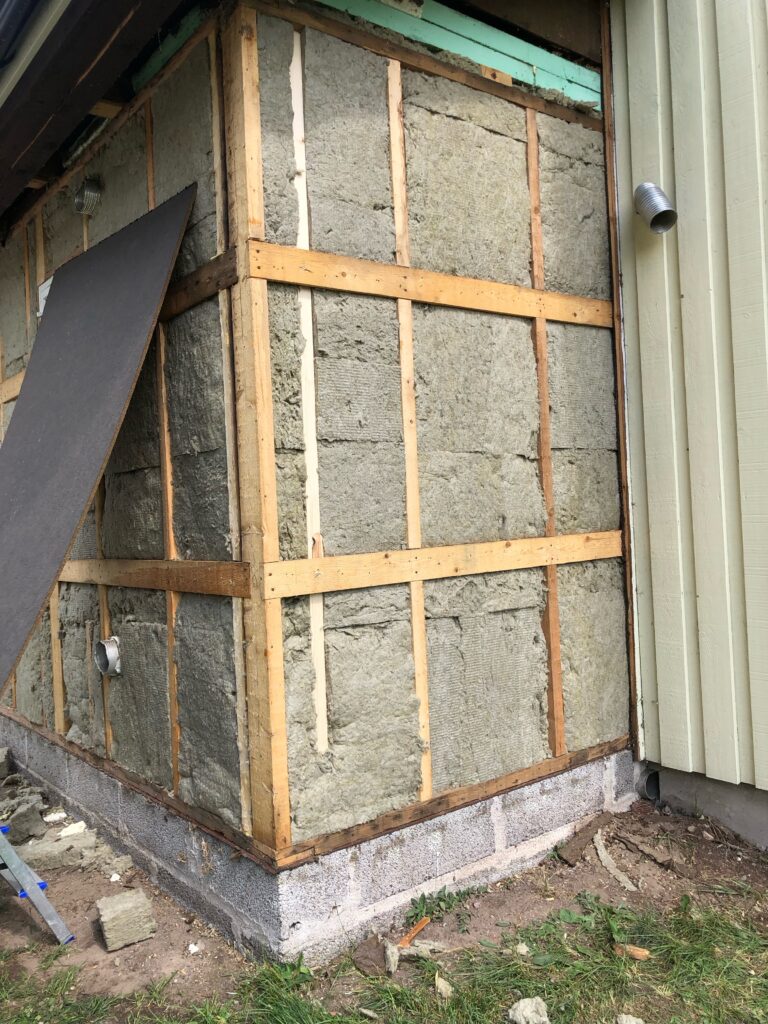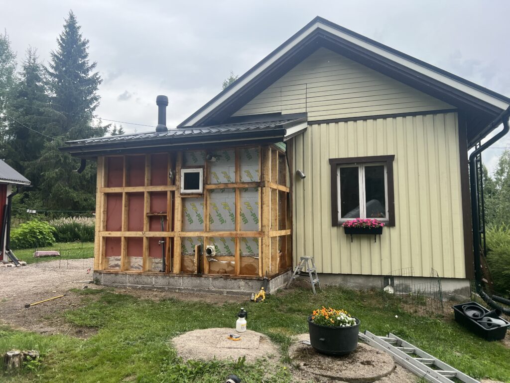 seinät eristettiin uudelleen jonka jälkeen asennettiin Huntonin puukuitulevy sekä koolaus jolla aikaansaatiin ilmaväli sekä uusi lomalautaverhous.