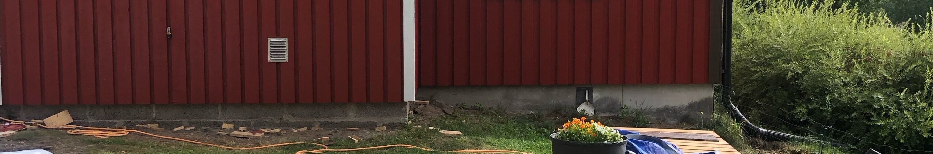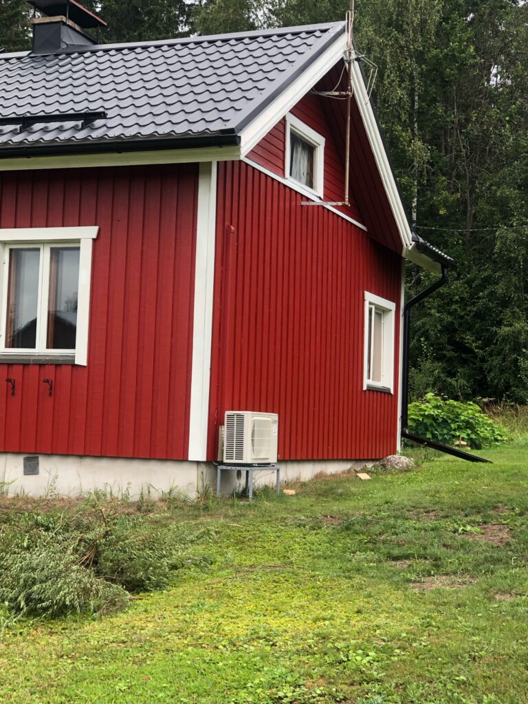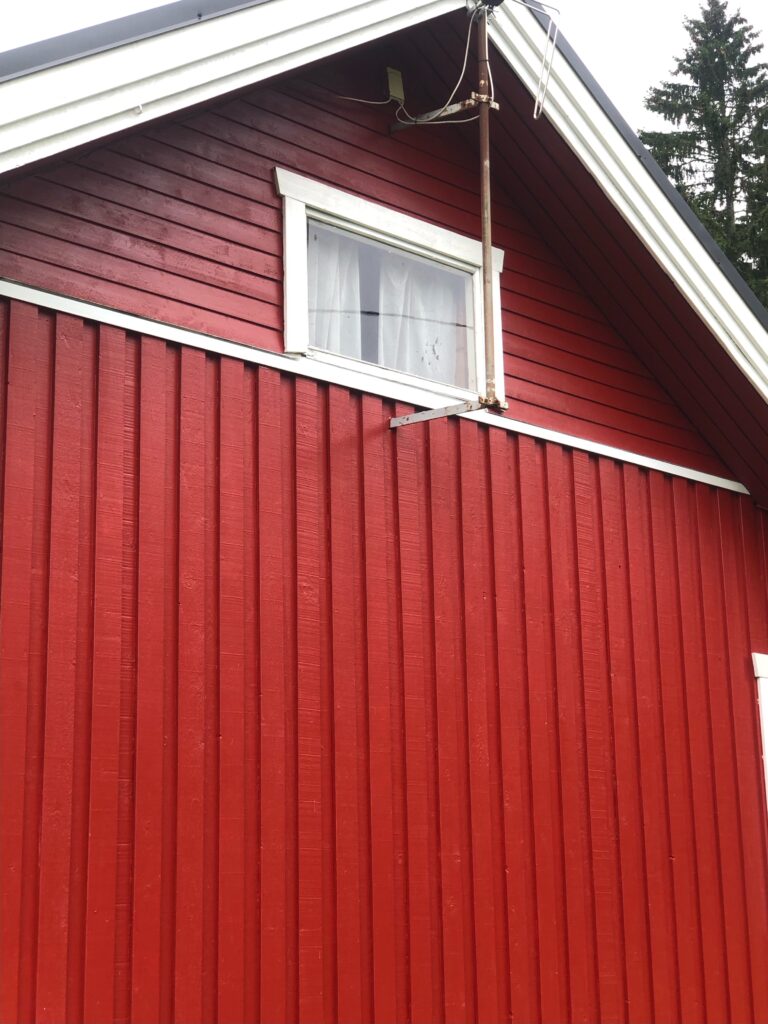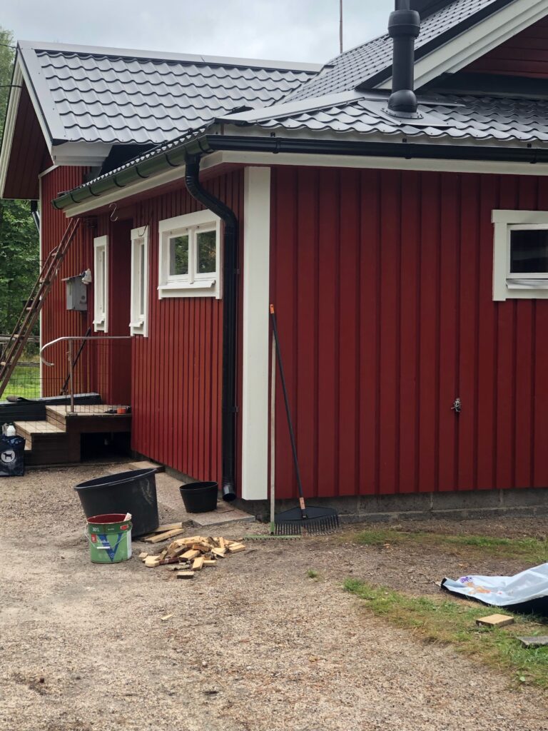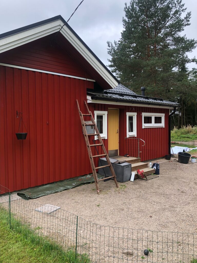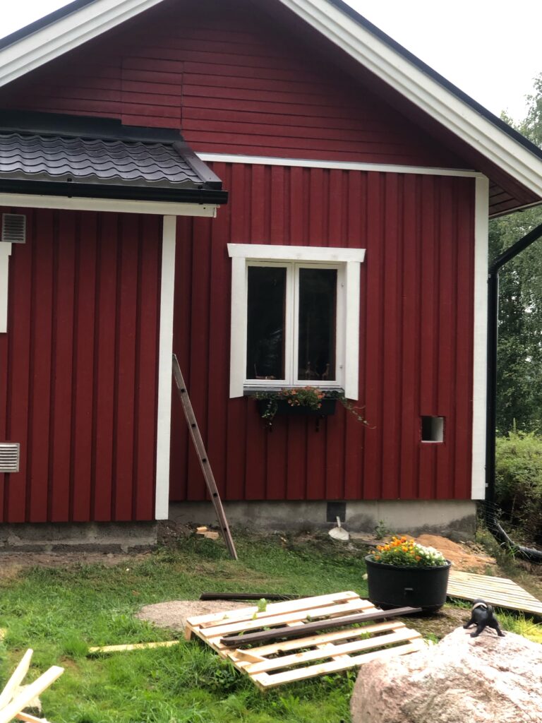 Luonnollisesti seinät myös maalattiin kuten pitääkin kun tehdään valmista. Asiakas halusi vaihtaa talon värin punaiseksi joka ei tietenkään ollut ongelma joten sovimme että koko loppu talokin maalattiin punaiseksi. Nyt on punainen tupa ja perunamaa:)
